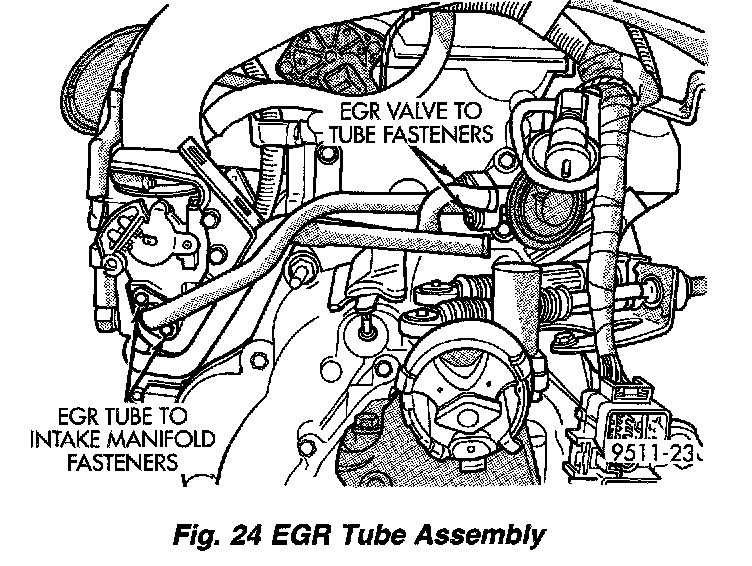 18. Remove EGR tube bolts at the valve and at the intake manifold. Remove tube from engine (Fig.24).