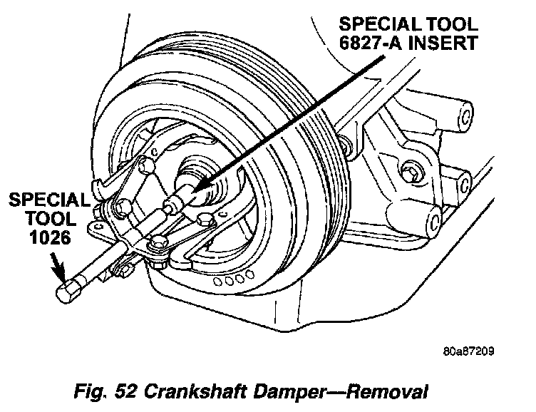 3. Remove crankshaft damper bolt. Remove damper using Special Tool 1026 and Insert 6827-A (Fig. 52).