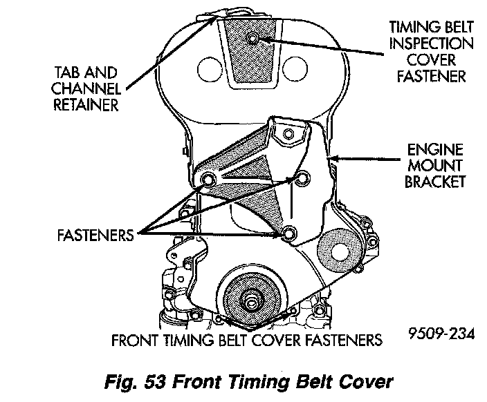 7. Remove front timing belt cover fasteners and remove cover (Fig. 53).