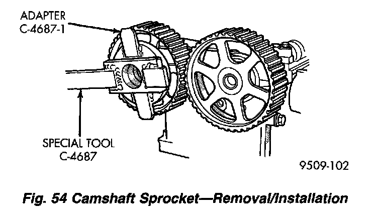 3. Hold camshaft sprockets with Special Tools C-4687 and Adapter C-4687-1, while removing attaching bolts (Fig. 54). Remove camshaft sprockets.