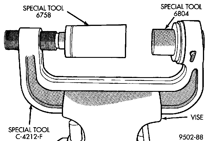 1. Mount Remover/Installer, Special Tool C-4212-F, in a vise as shown. Install Bushing Remover, Special Tool 6804, and Bushing Receiver, Special Tool 6758, on Special Tool C-4212-F.