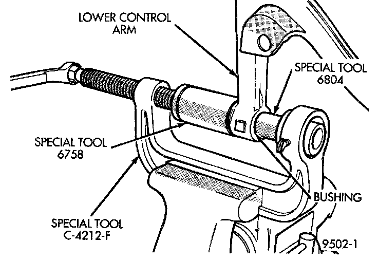 2. Install the lower control arm in Special Tool C-4212-F as shown. Be sure Special Tool 6758 is square on the lower control arm and Special Tool 6804 is positioned correctly on the isolator bushing.