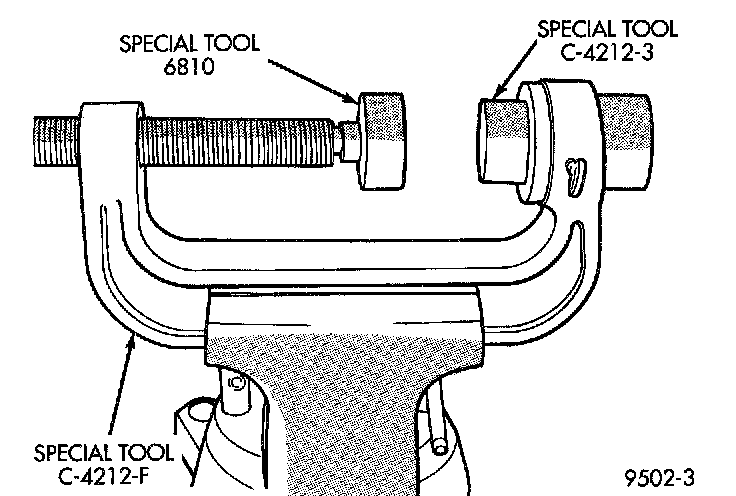 4. Mount Installer Cup, Special Tool C-4212-3 on the Remover/Installer, Special Tool C-4212-F. Mount Bushing Installer, Special Tool 6810, on the screw portion of Special Tool C-4212-F.