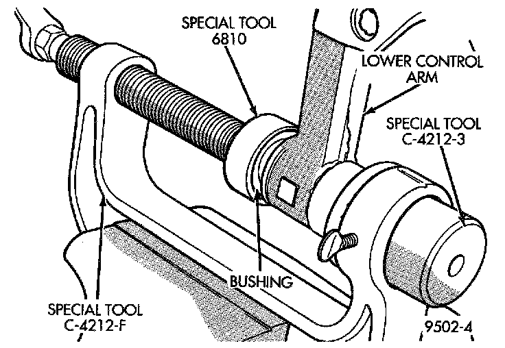 3. Tighten the screw on Special Tool C-4212-F to press the front bushing out of the lower control arm. Remove the bushing and the lower control arm from Special Tool C-4212-F.