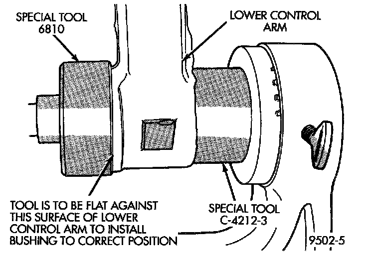 7. Tighten screw on Special Tool C-4212-F pressing the front bushing into the lower control arm. Continue pressing front bushing into lower control arm until the bushing is sitting flush on the machined surface of the lower control arm. Remove the lower control arm from the special tools.
