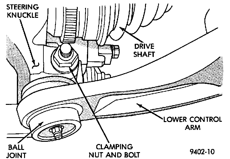 2. Remove the steering knuckle-to-ball joint ball stud clamping nut and bolt.