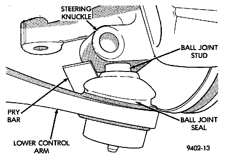 5. Using a pry bar, separate the steering knuckle from the ball joint stud. Use caution when separating ball joint stud from steering knuckle to avoid cutting the ball joint seal.
