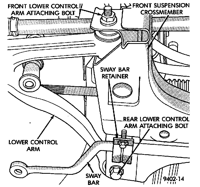 4. Loosen, but do not remove the bolts attaching the stabilizer bar retainers to front suspension crossmember. Then rotate stabilizer bar and attaching links away from lower control arms