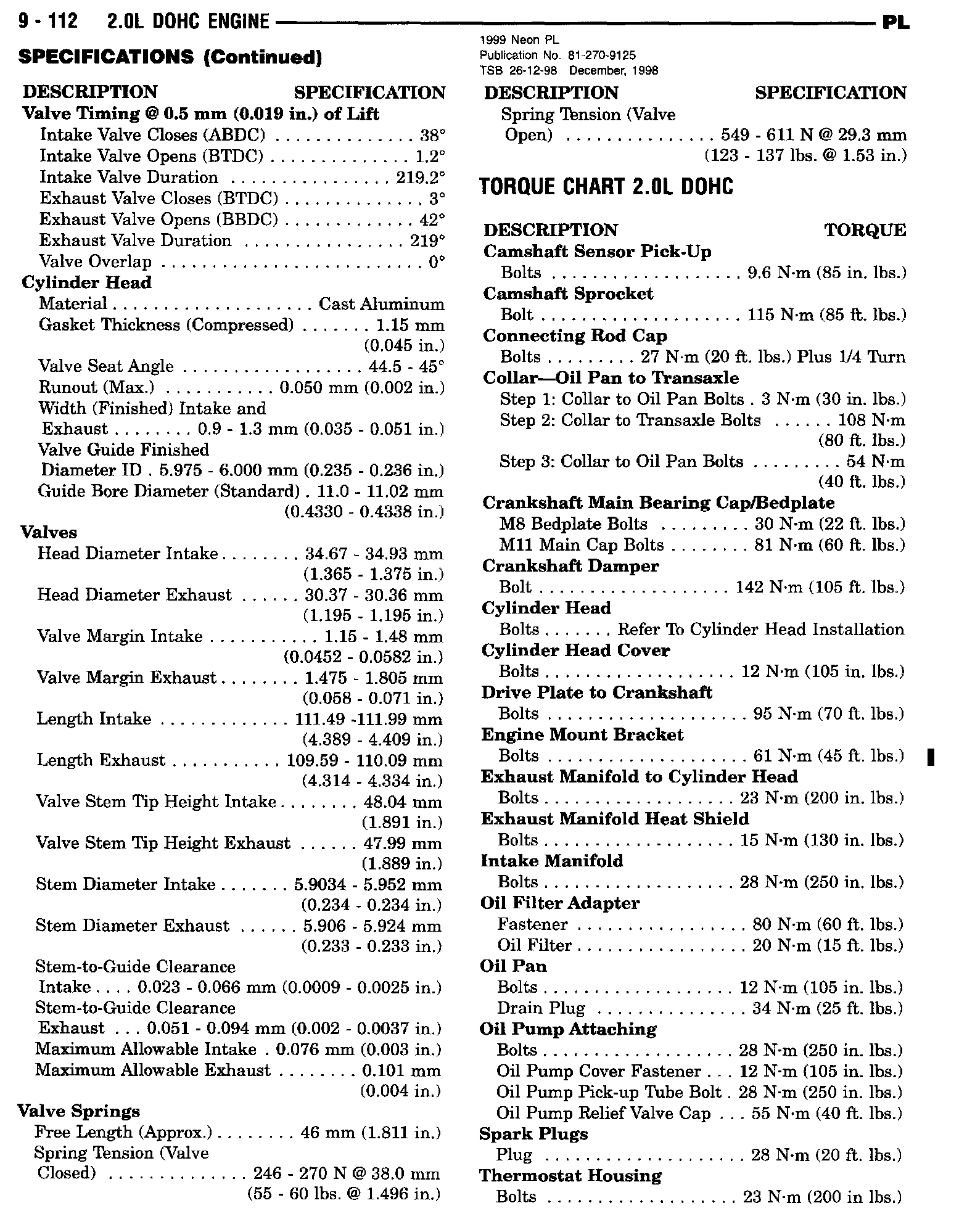 1999 Neon Service Manual - Publication Number 81-270-9125
