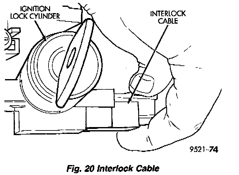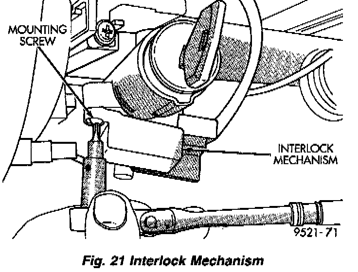 3. Remove the two interlock mechanism-to-steering column attaching screws (Fig. 21). Remove the interlock housing.