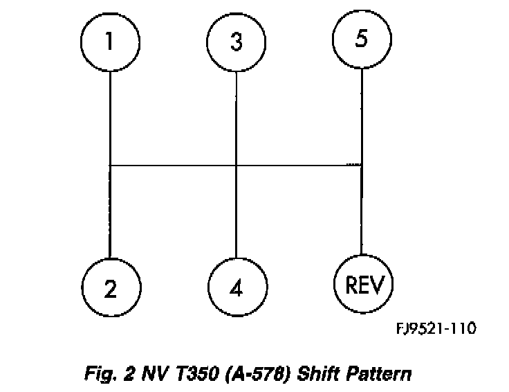 The NV T350 (A-578) transaxle shift pattern is a modified H-pattern. Overdrive fifth and reverse gears are in-line and outboard of the first through fourth gear positions.