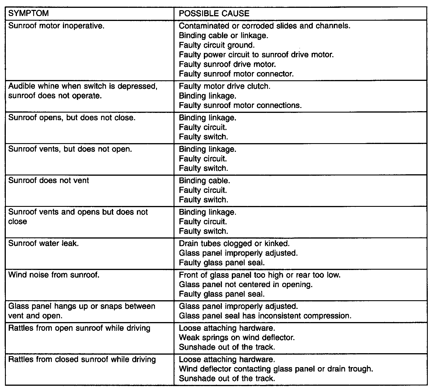 Sunroof Diagnosis Chart: