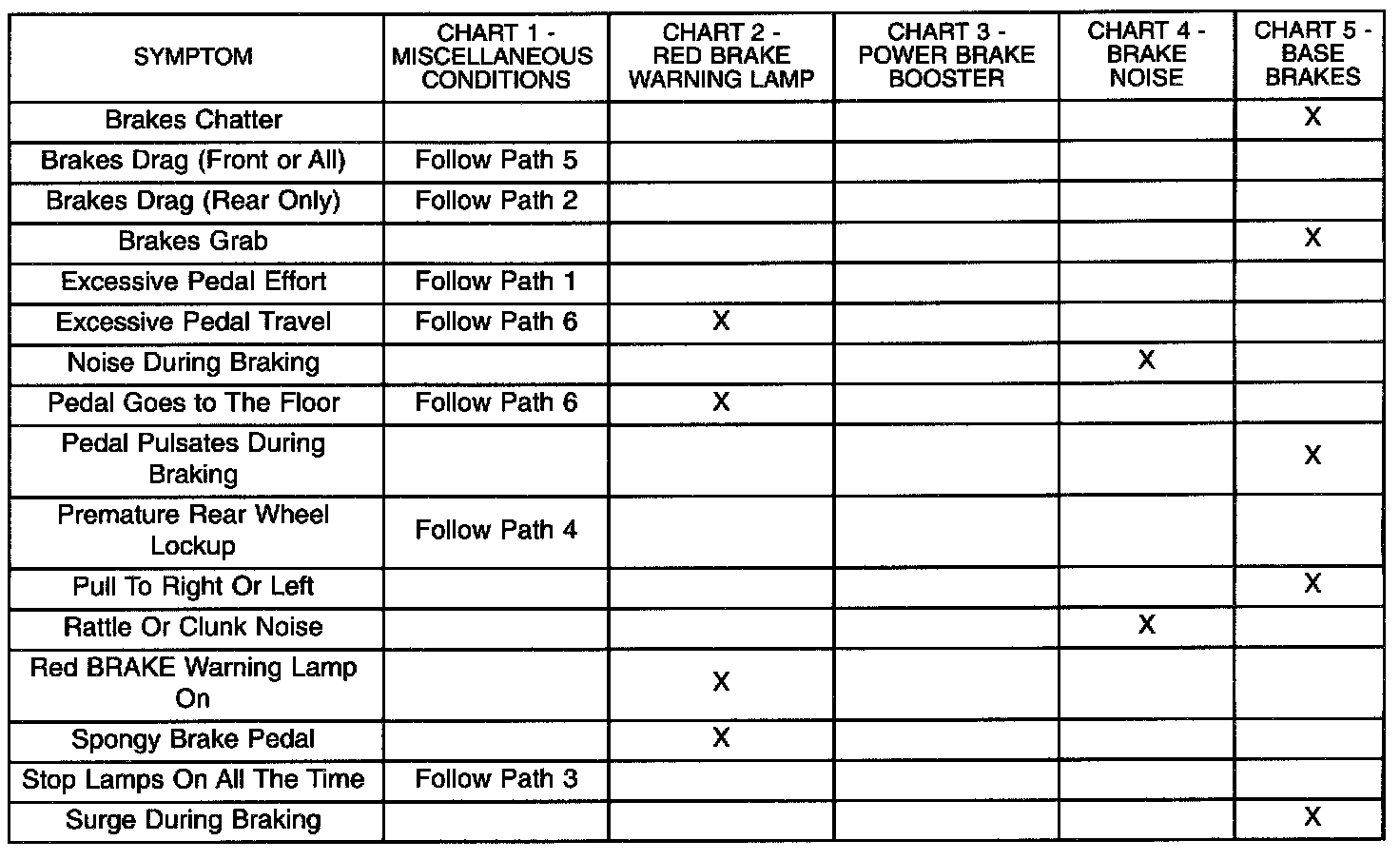Use the Diagnosis Chart Guide for direction to the appropriate diagnosis chart.- Base brake symptoms are listed down the left column.