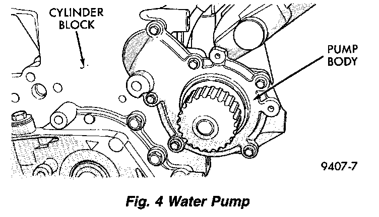The water pump has a diecast aluminum body and housing with a stamped steel impeller. The water pump bolts directly to the block. Cylinder block to water pump sealing is provided by a rubber O-ring. The water pump is driven by the timing belt. Refer to Timing Components for component removal to access the water pump.