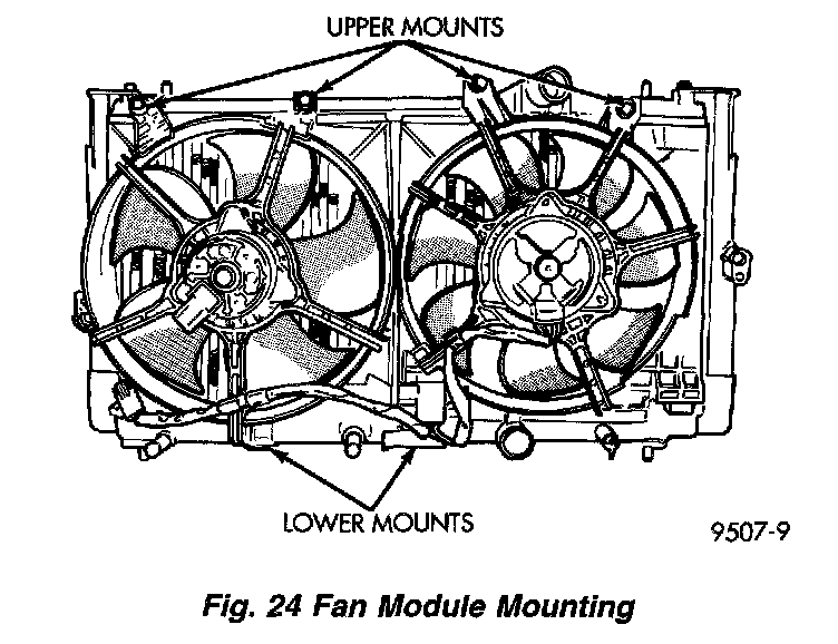 9. Remove fan shroud retaining screws, located on the top of the shroud. Lift shroud up and out of bottom shroud attachment clips separating shroud from radiator. For dual fan applications, the left fan module may be removed first, then the right side module last. Fan damage should always be avoided.