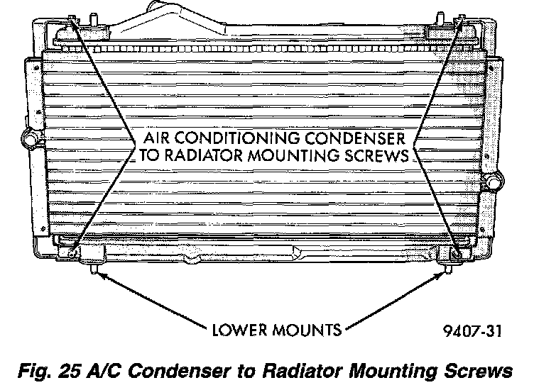 12. Remove the air conditioning condenser attaching screws located at the front of the radiator, if equipped, then lean condenser forward.