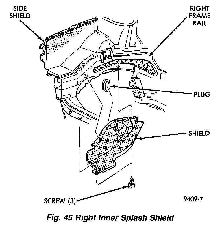 2. Raise vehicle on a hoist and remove right inner splash shield (Fig. 45).