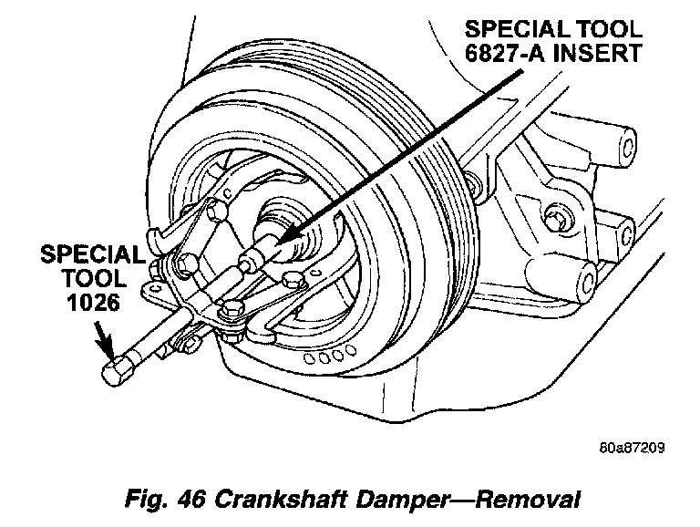 3. Remove crankshaft damper bolt. Remove damper using the large side of Special Tool 1026 and insert 6827-A (Fig. 46).