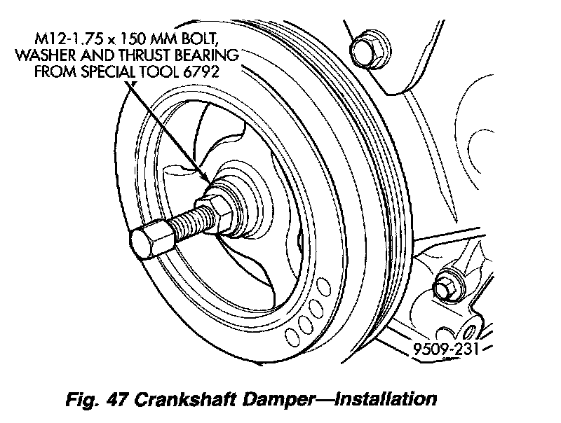 1. Install crankshaft damper using M12-1.75 x 150 mm bolt, washer, thrust bearing and nut from Special Tool 6792. Install crankshaft damper bolt and tighten to 142 Nm (105 ft. lbs.) (Fig. 47).