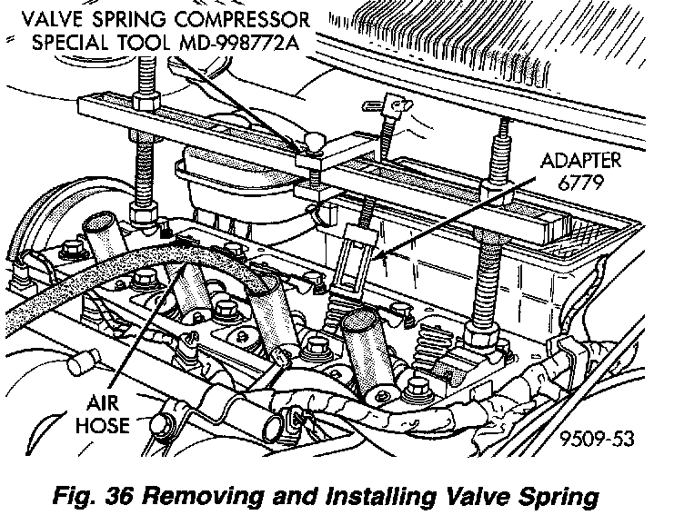 4. Using Special Tool MD-998772A with adapter 6779 (Fig. 36) compress valve springs and remove valve locks.