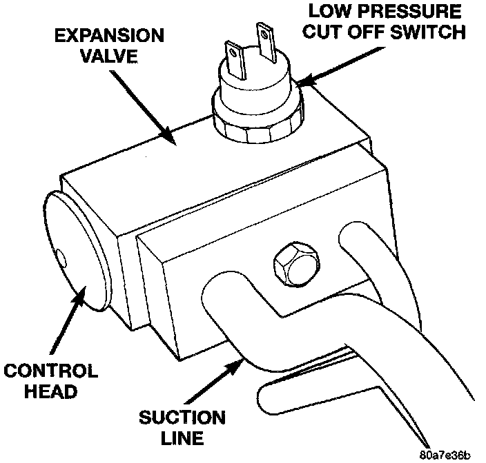 The Low Pressure Cut Off Switch monitors the refrigerant gas pressure on the suction side of the system. The low pressure cut off switch is located on the expansion valve. The low pressure cut off switch turns off voltage to the compressor clutch coil when refrigerant gas pressure drops to levels that