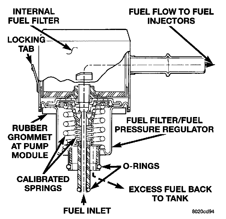The fuel filter/fuel pressure regulator is located on the top of the fuel pump module. A separate frame mounted fuel filter is not used.