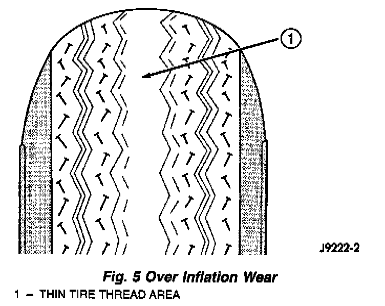 Over inflation causes rapid center wear and loss of the tire's ability to cushion shocks.