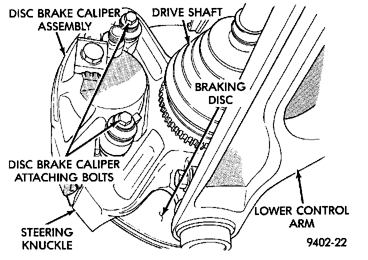 4. Remove the disc brake caliper from the steering knuckle. The caliper is removed by first lifting the bottom of caliper away from steering knuckle, and then removing the top of caliper out from under the steering knuckle.