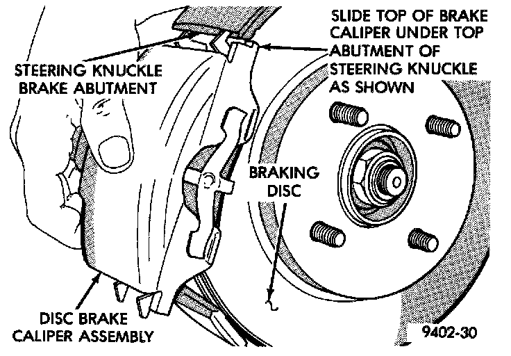 4. Install the disc brake caliper on steering knuckle. The caliper is installed by first sliding the top of the caliper under the top abutment on the steering knuckle. Then install the bottom of the caliper against the bottom abutment on the steering knuckle.