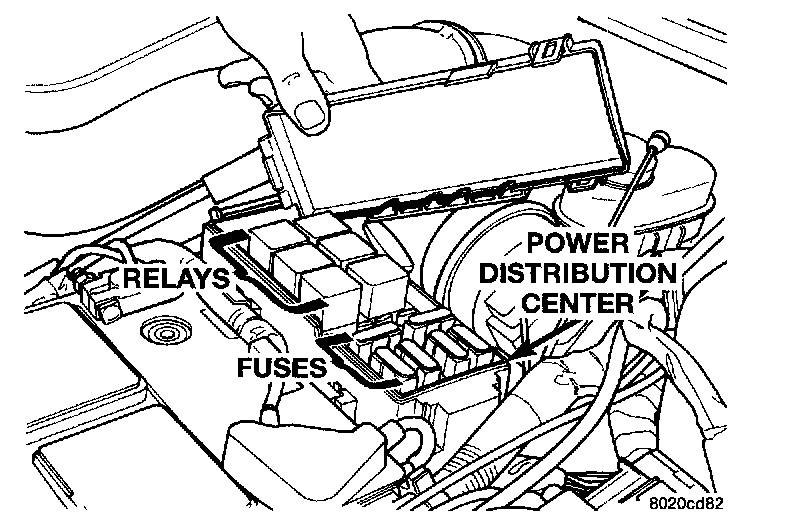 The PDC contains the starter relay, radiator fan relay, A/C compressor clutch relay, auto shutdown relay, fuel pump relay and several fuses.