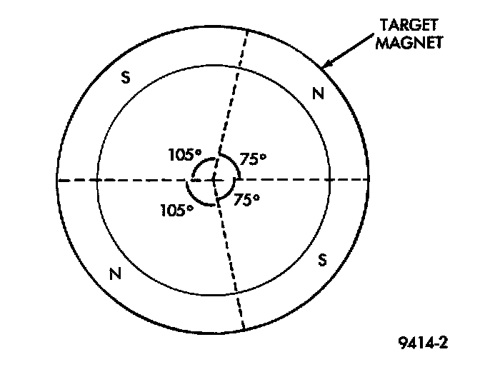 A target magnet attaches to the rear of the camshaft and indexes to the correct position. The target magnet has four different poles arranged in an asymmetrical pattern. As the target magnet rotates, the camshaft position sensor senses the change in polarity. The sensor output switch switches from high (5.0 volts) to low (0.5 volts) as the target magnet rotates. When the north pole of the target magnet passes under the sensor, the output switches high. The sensor output switches low when the south pole of the target magnet passes underneath.