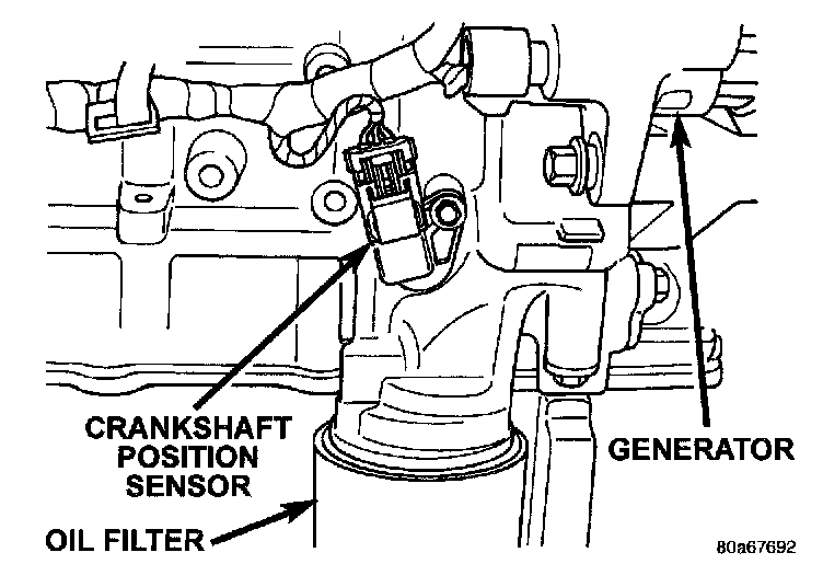 The crankshaft position sensor mounts to the engine block behind the alternator, just above the oil filter.