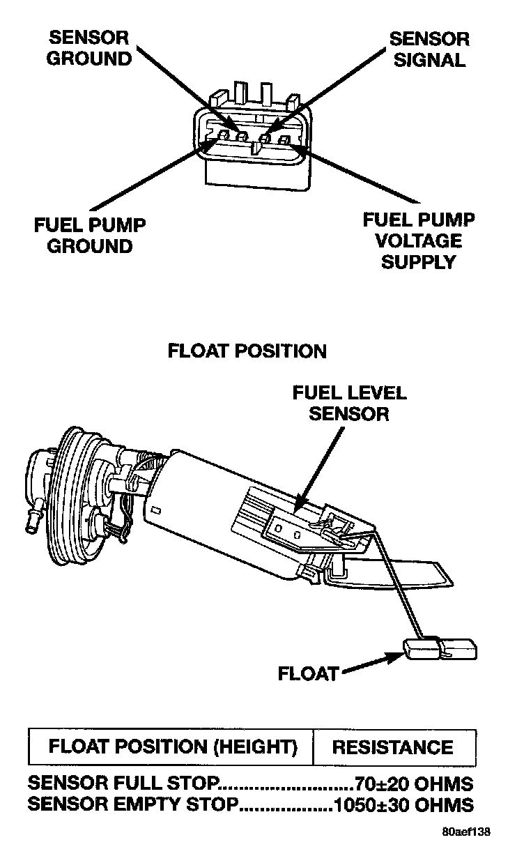 The level sensor is a variable resistor. Its resistance changes with the amount of fuel in the tank. The float arm attached to the sensor moves as the fuel level changes. To test the level sensor, connect an ohmmeter across the sensor signal and sensor ground terminals of the fuel pump module connector. Move the float lever to the positions shown in the resistance chart. Record the resistance at each point. Replace the level sensor if the resistance is not within specifications.