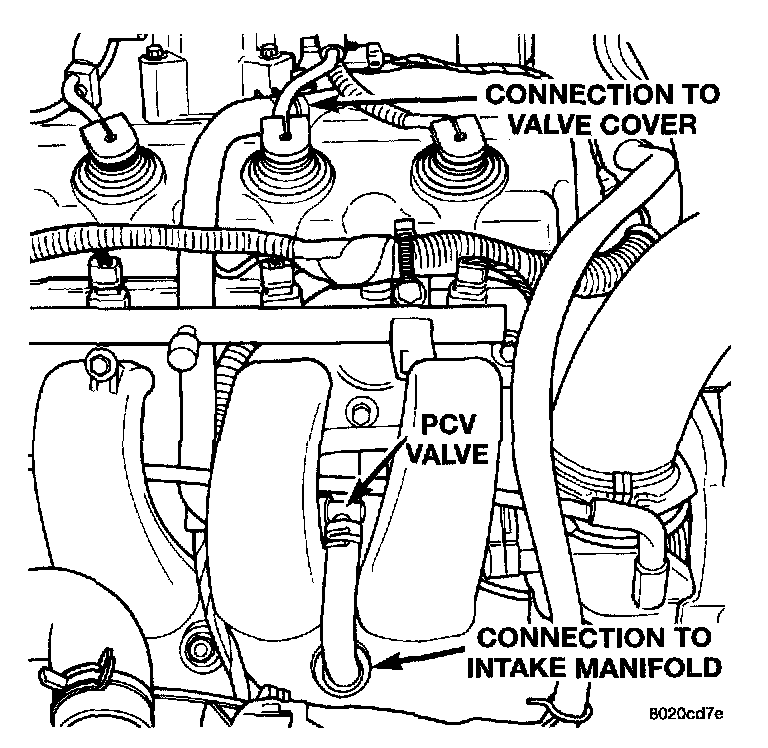 6. Check hose connections between the PCV valve, vacuum port-intake manifold and the oil separator.