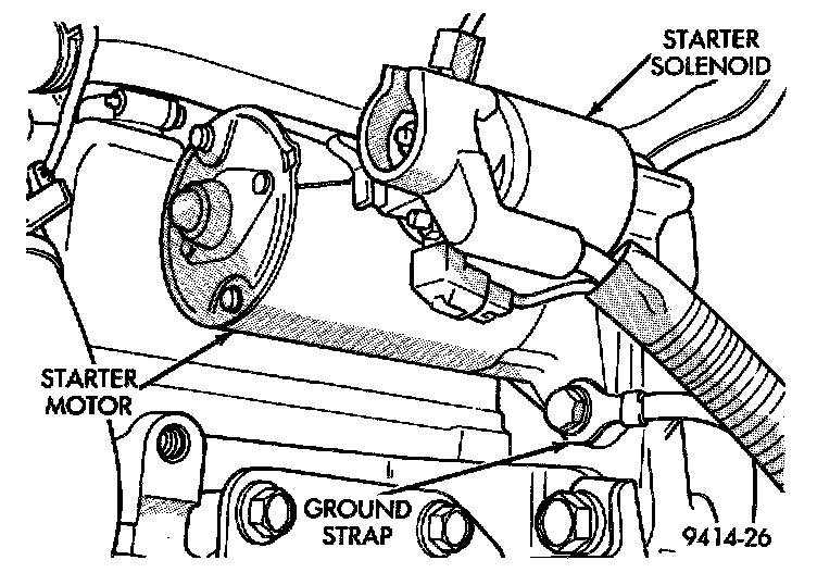 12. Inspect for corrosion on the electrical connections at the starter motor solenoid. Check the ground cable connection below the starter motor.