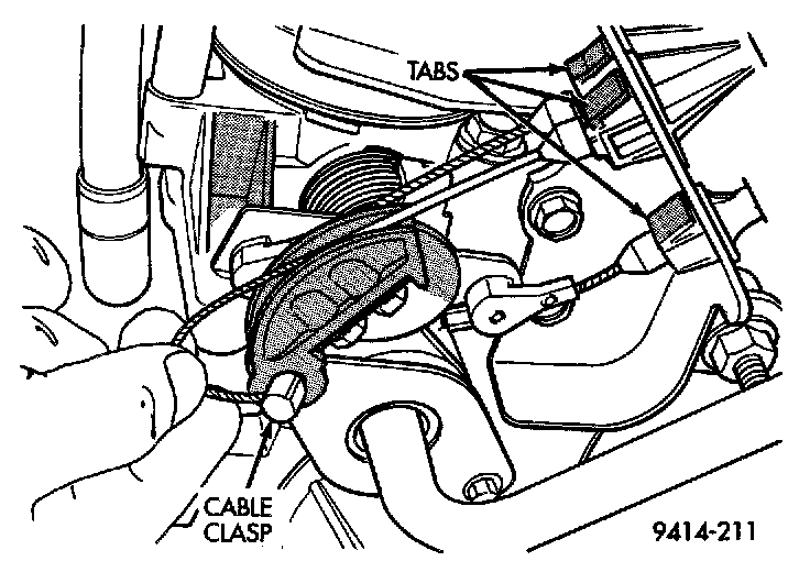 7. From the engine compartment, rotate the throttle lever forward to the wide open position and install throttle cable clasp.
