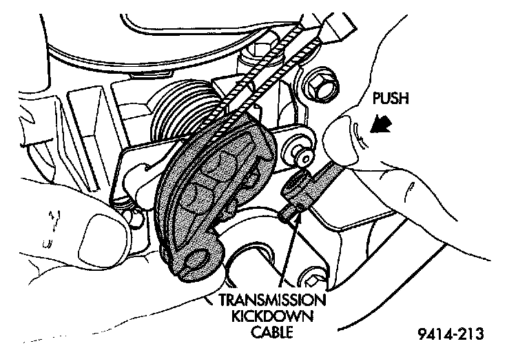 5. Hold throttle lever in the wide open position. Using finger pressure only, remove kickdown cable by PUSHING connector off the lever nail head. DO NOT try to pull connector off perpendicular to the lever.