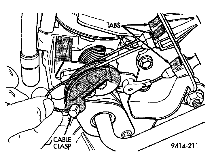 5. From the engine compartment, rotate the throttle lever forward to the wide open position and install cable clasp.