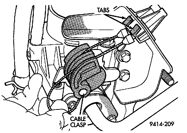 5. From the engine compartment, rotate the throttle lever forward to the wide open position and install cable clasp.