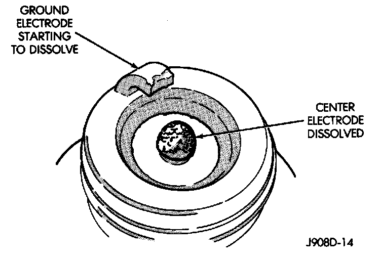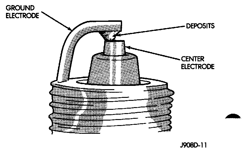Loose deposits in the combustion chamber can cause electrode gap bridging. The deposits accumulate on the spark plugs during continuous stop and-go driving. When the engine is suddenly subjected to a high torque load, the deposits partially liquefy and bridge the gap between the electrodes. This short circuits the electrodes. Spark plugs with electrode gap bridging can be cleaned and reused.