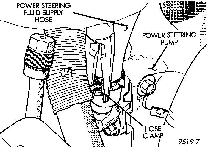 4. Remove the hose clamp attaching the power steering fluid supply hose to the power steering pump suction fitting. Remove the power steering fluid supply hose from the power steering pump fitting.
