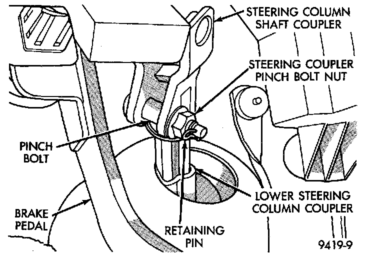 11. From interior of vehicle, reconnect the steering gear coupler with the steering column shaft coupler. Install steering gear coupler retaining pinch bolt and torque to 28 Nm (250 inch lbs.). Be sure to install the upper to lower steering coupler retaining bolt, retention pin.