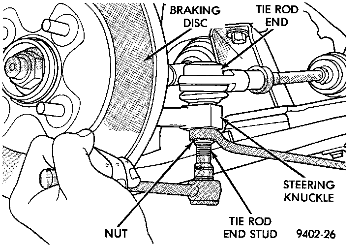 5. Remove nuts attaching both outer tie rod ends to the steering knuckles. Nuts are to be removed from tie rod ends using the following procedure, hold tie rod end stud with an 11/32 socket, while loosening and removing nut with wrench.