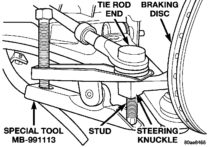 6. Remove tie rod ends from steering knuckles using Remover, Special Tool MB-991113.
