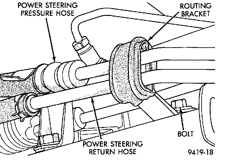 5. Install the power steering pressure and return hose routing bracket and attaching screw on front suspension crossmember. Torque hose routing bracket to crossmember attaching bolt to 23 Nm (17 ft. lbs.).
