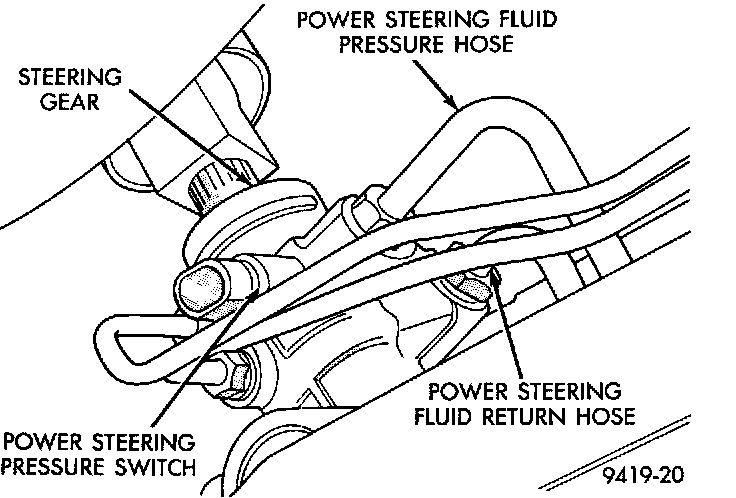 9. Remove the power steering fluid pressure and return hoses from the power steering gear assembly.