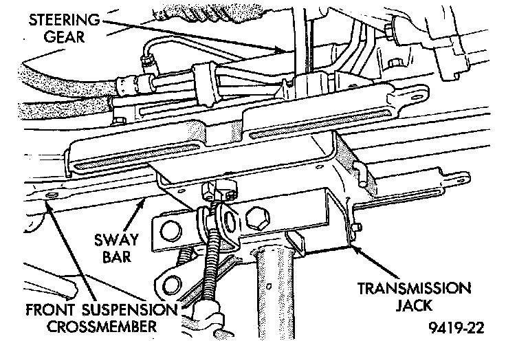 11. Position a transmission jack under the center of the front suspension crossmember. Transmission jack is used to lower, support and raise front suspension crossmember when removing steering gear assembly.