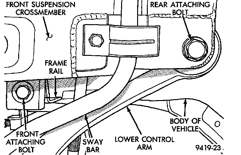 12. Loosen and fully remove the front 2 bolts attaching front suspension crossmember to frame rails of vehicle. Then loosen the 2 rear bolts attaching front suspension crossmember and lower control arm to body of vehicle. Lower front suspension crossmember while loosening rear bolts, but do not remove rear bolts from crossmember.
