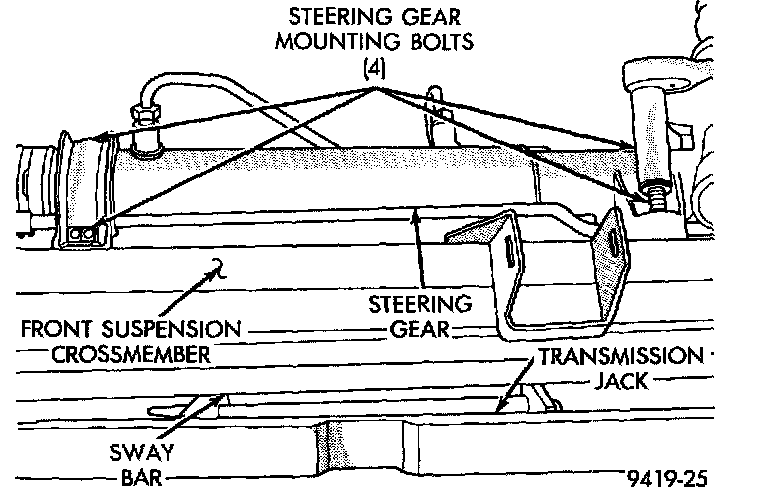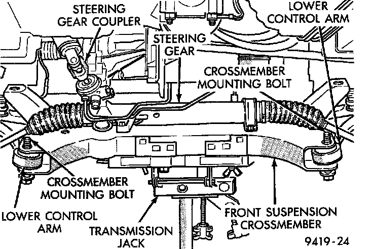 13. Using transmission jack, lower front suspension crossmember enough to allow steering gear to be removed from crossmember. When lowering front suspension crossmember, do not let crossmember hang from lower control arms weight of crossmember should be supported by transmission jack.