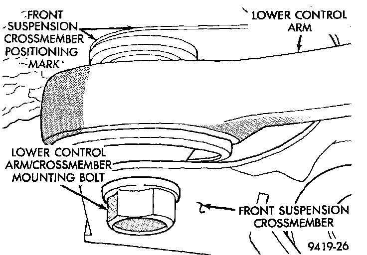 CAUTION: When front suspension crossmember is installed back in vehicle, crossmember must be aligned with positioning marks previously scribed into body of vehicle. This must be done to maintain "net build" front suspension alignment settings.
